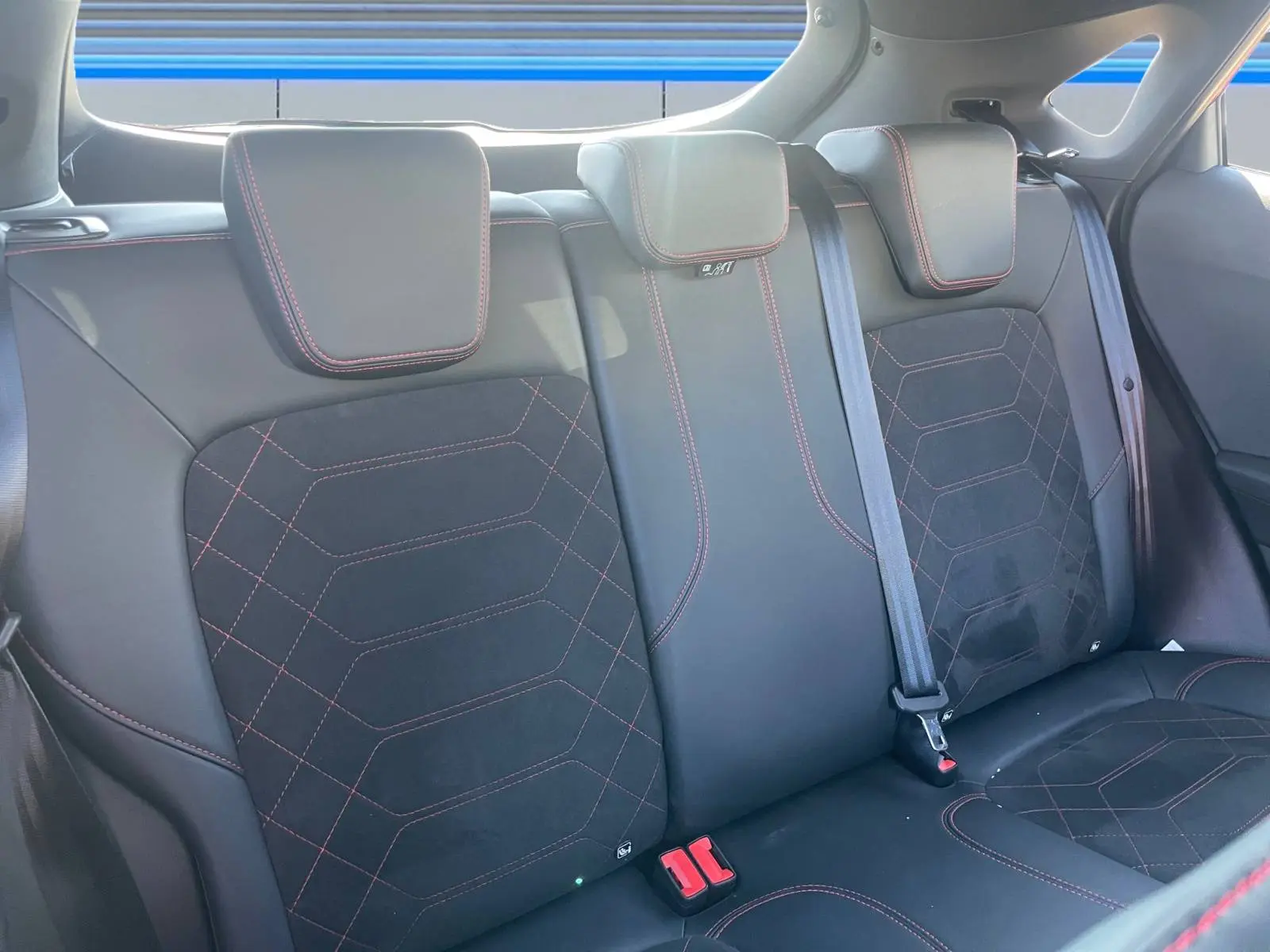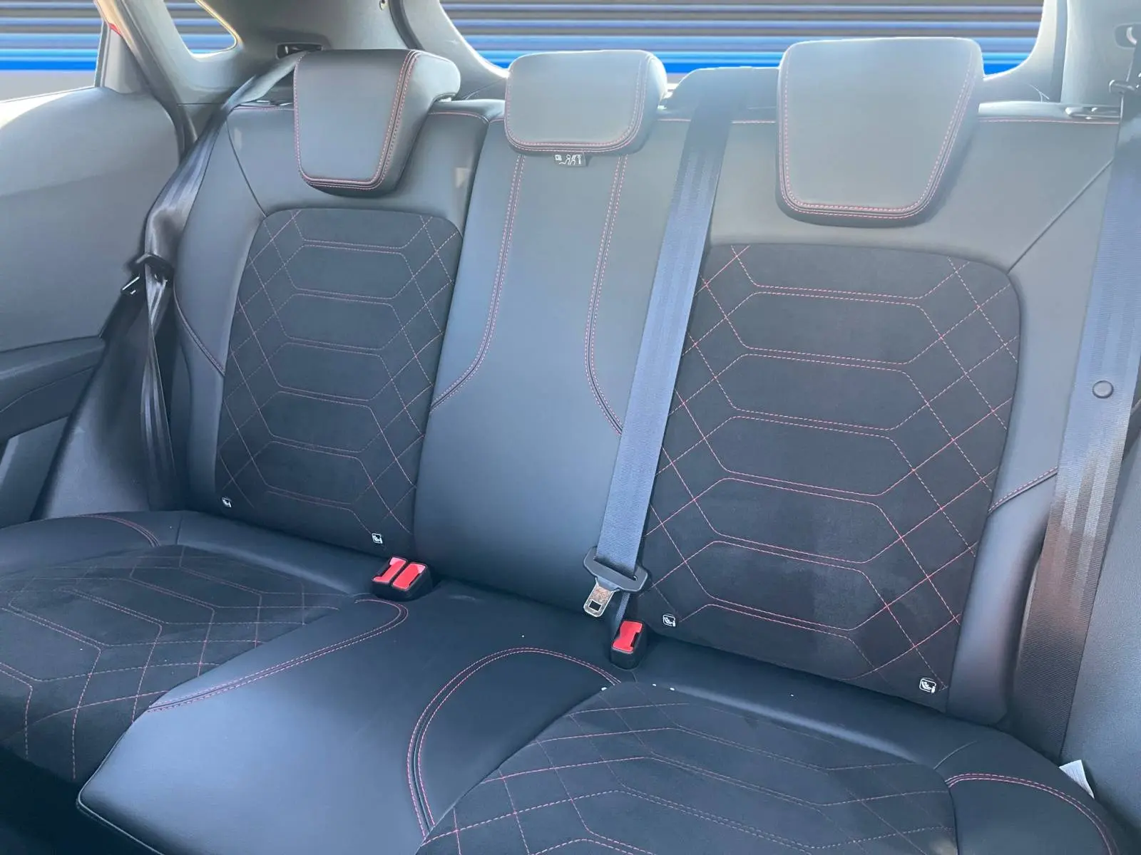 - Sellerie mixte suédine / vinyle noir avec surpiqûres rouges