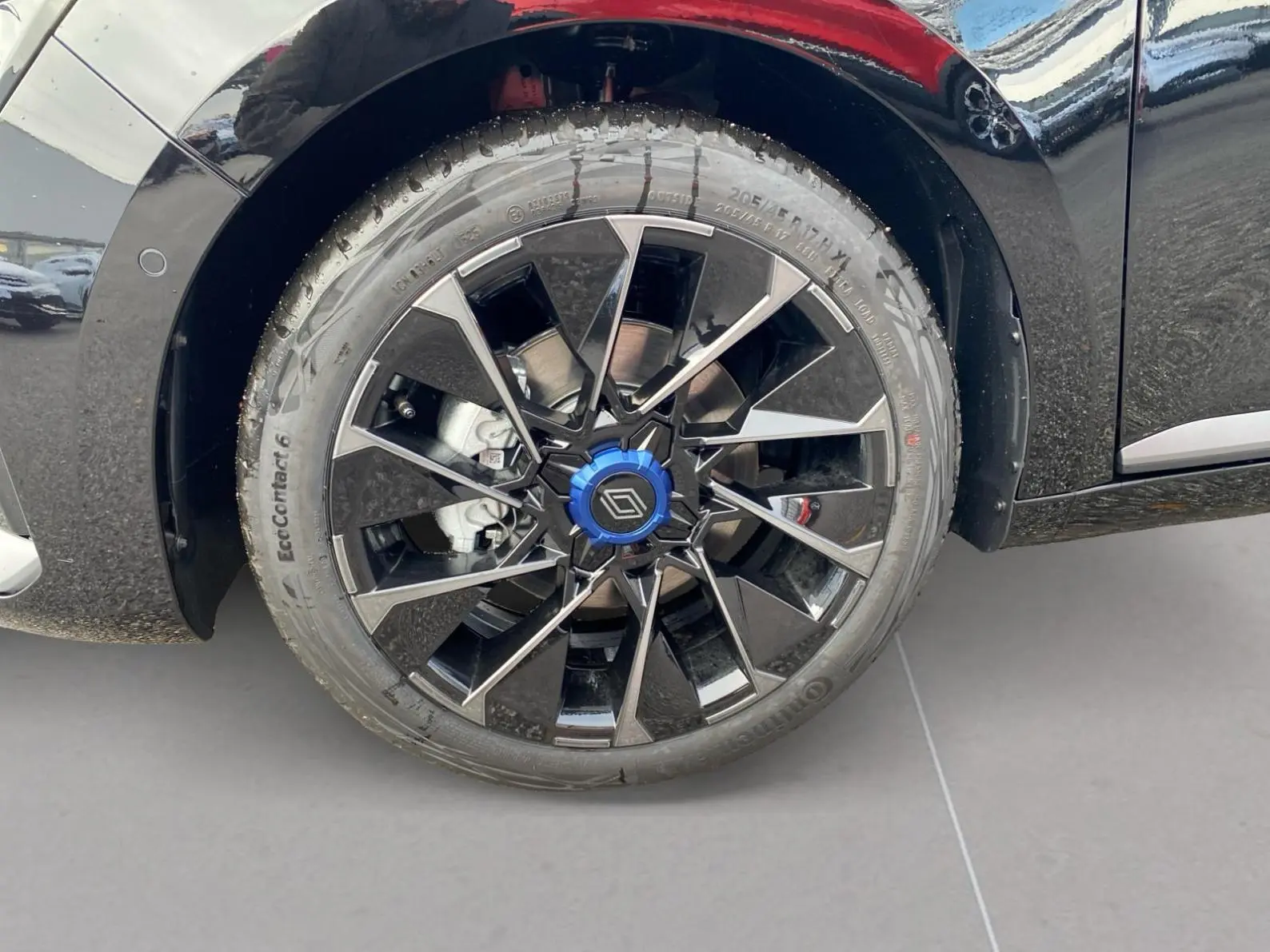 - Sellerie textile gris et textile enduit grainé noir avec surpiqures bleues