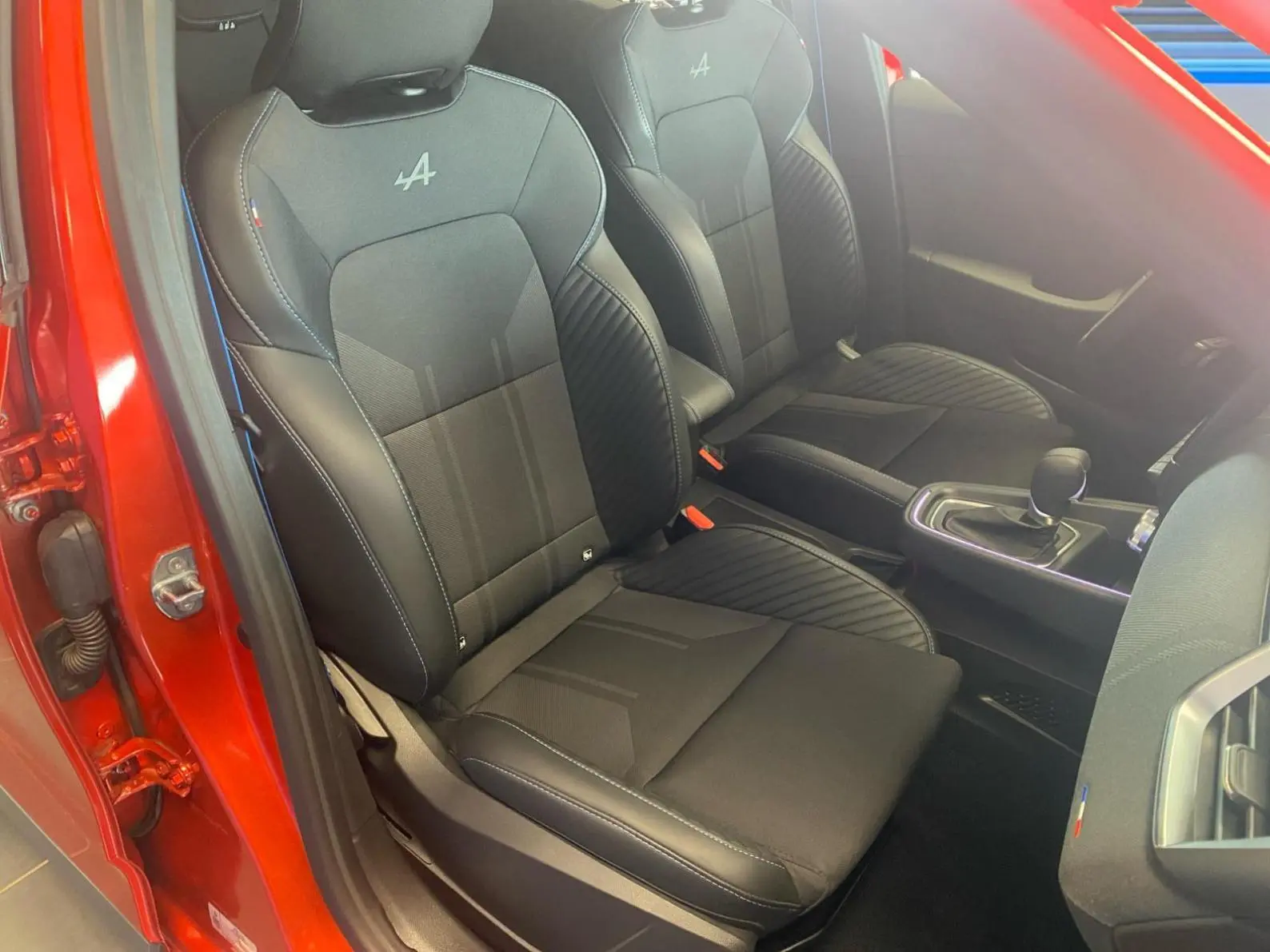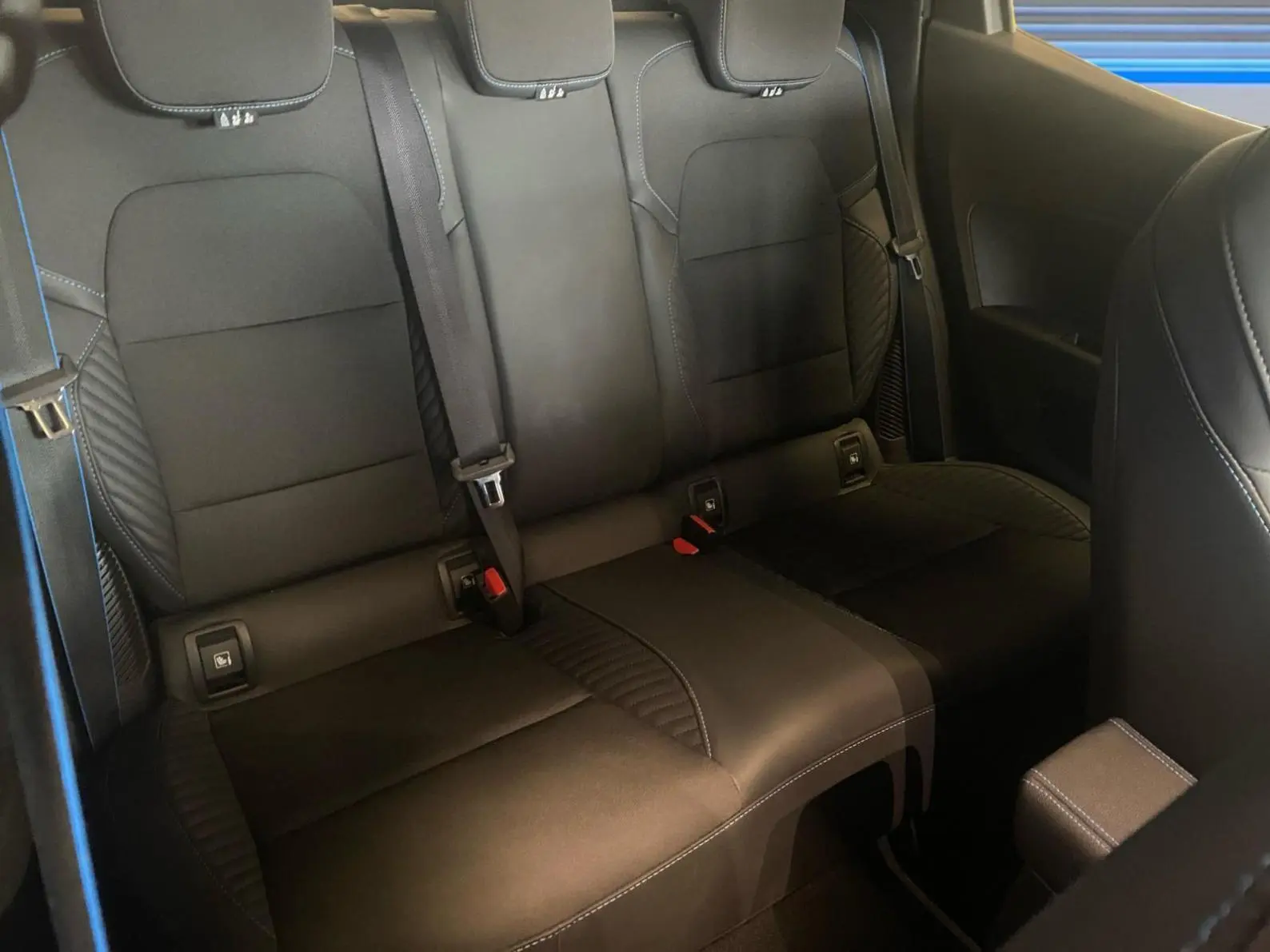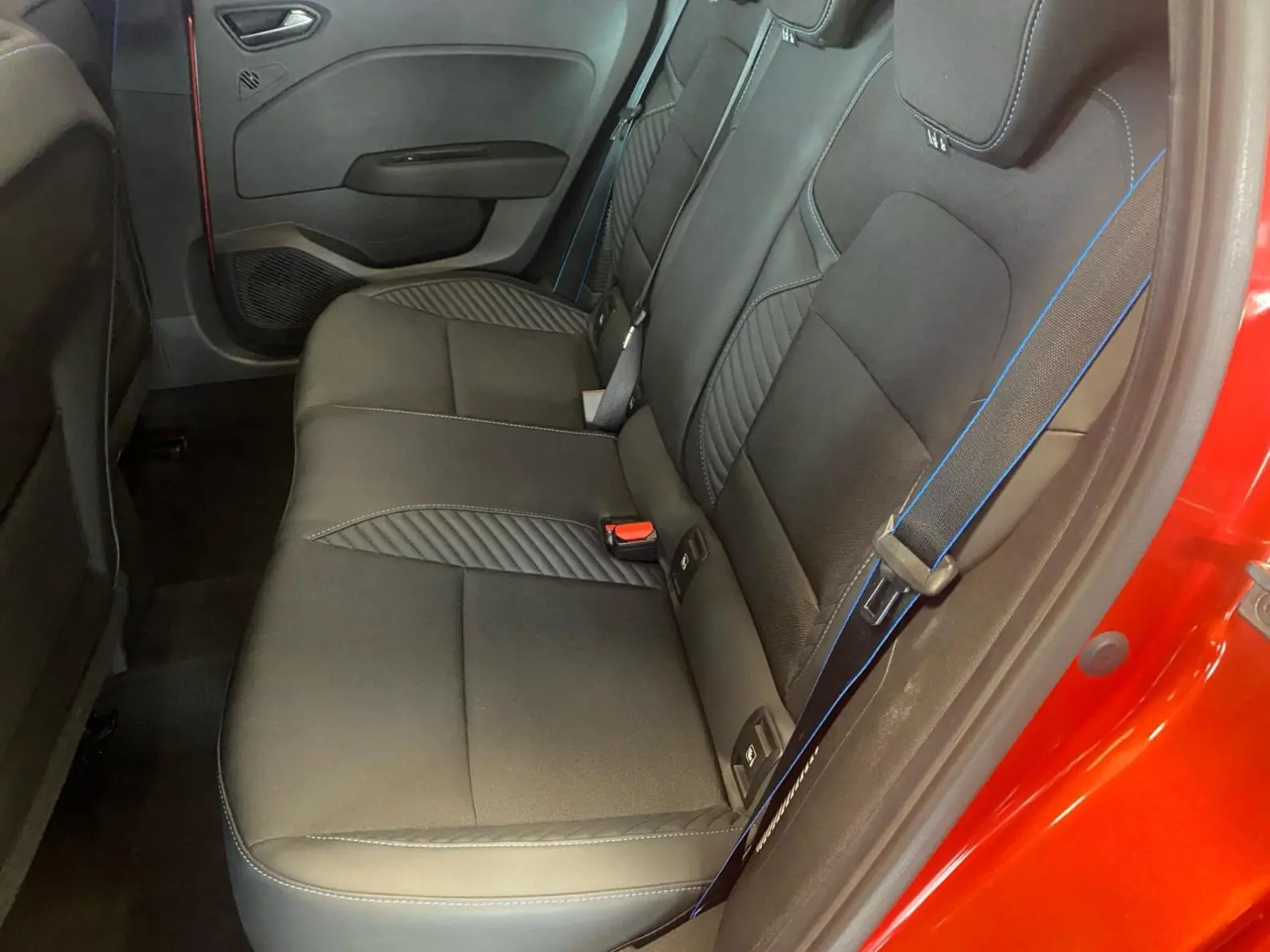 - Sellerie textile gris et textile enduit grainé noir avec surpiqûres bleues