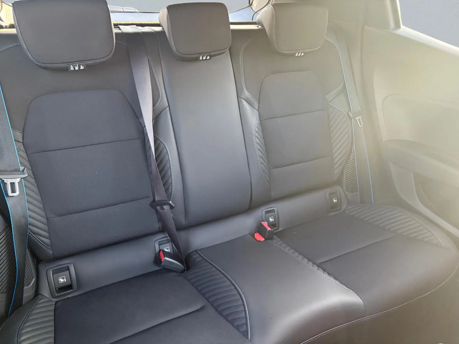- Sellerie textile gris et textile enduit grainé noir avec surpiqûres bleues