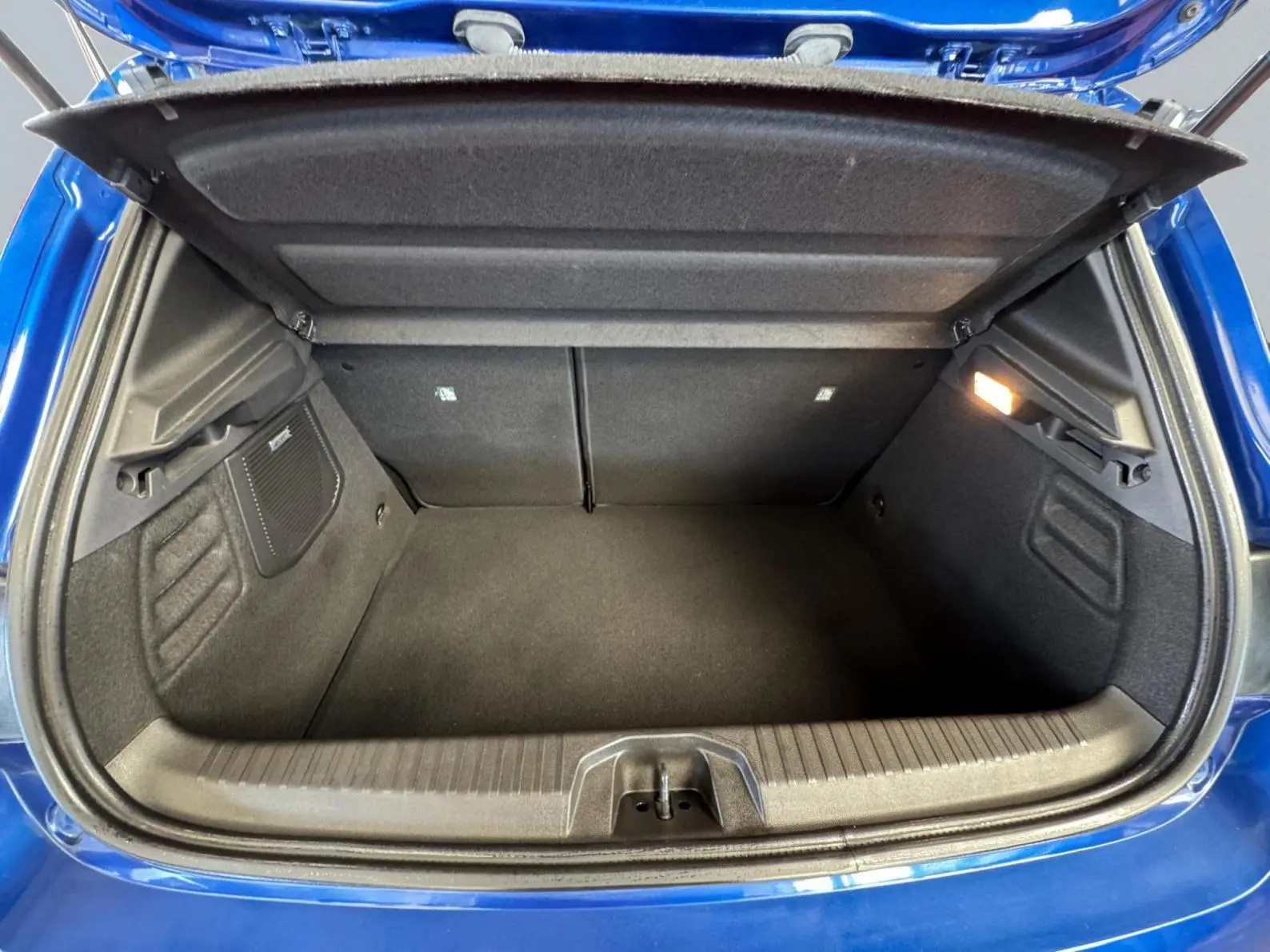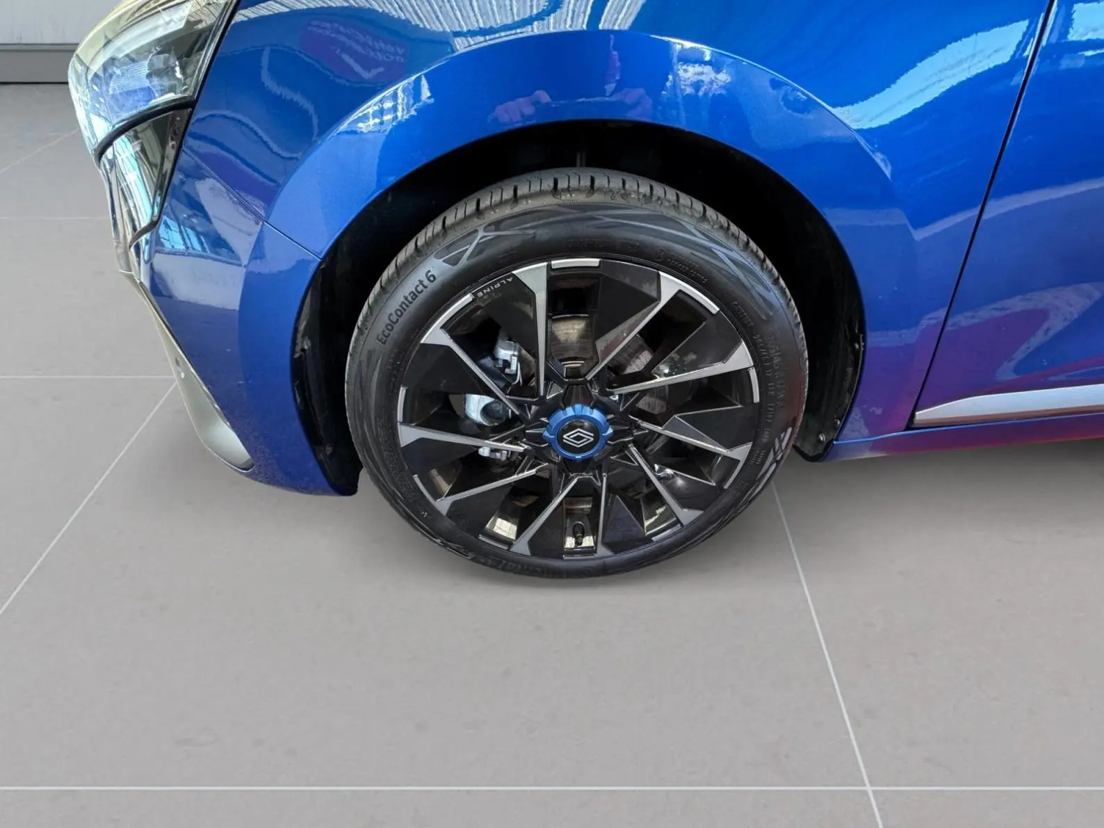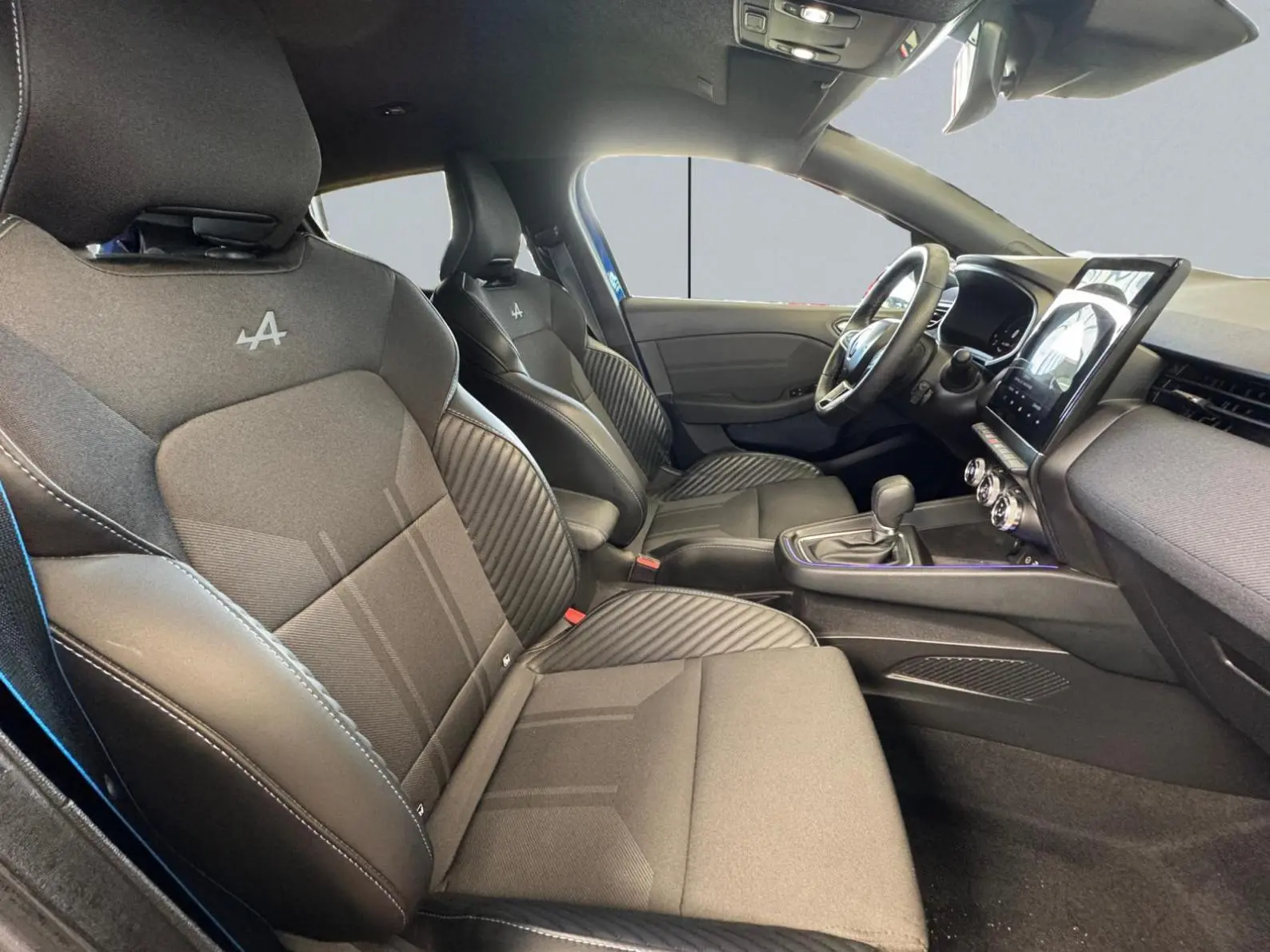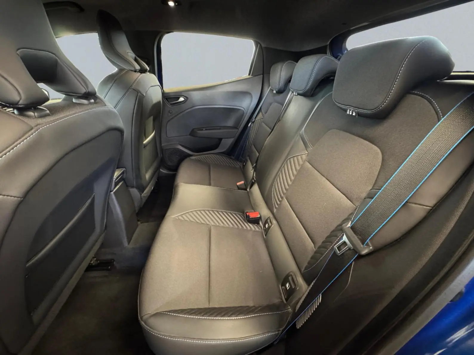 - Sellerie textile gris et textile enduit grainé noir avec surpiqûres bleues