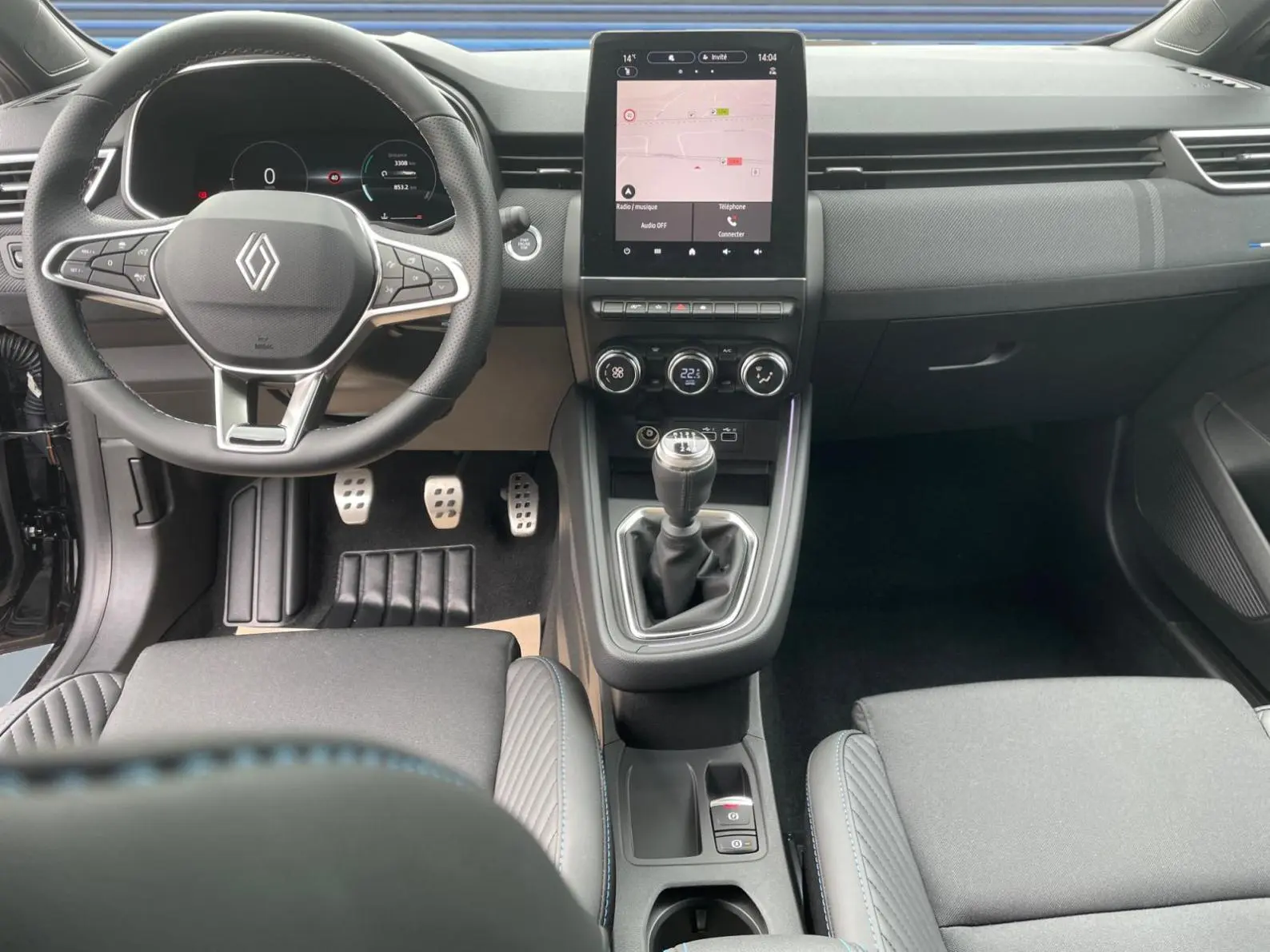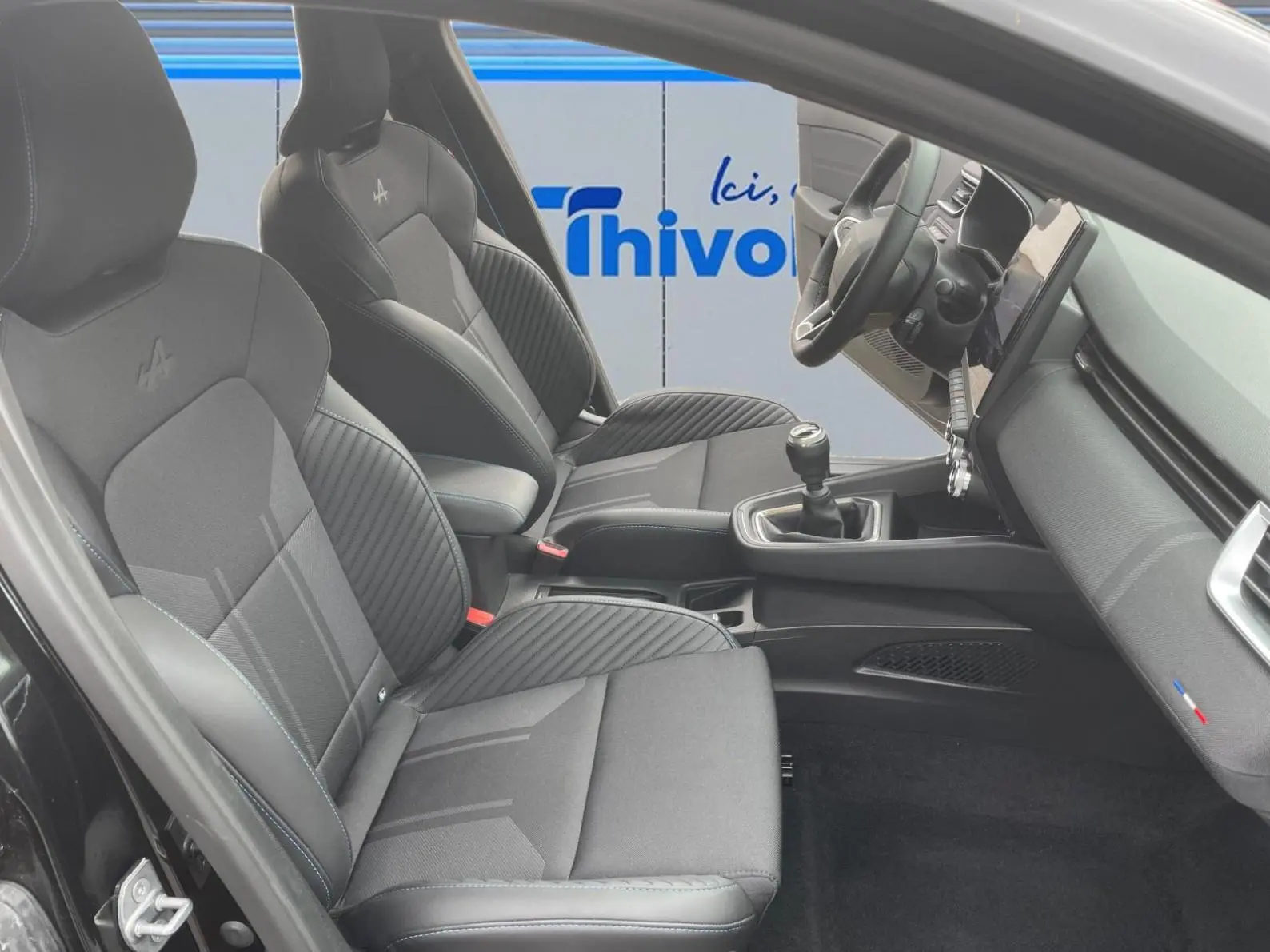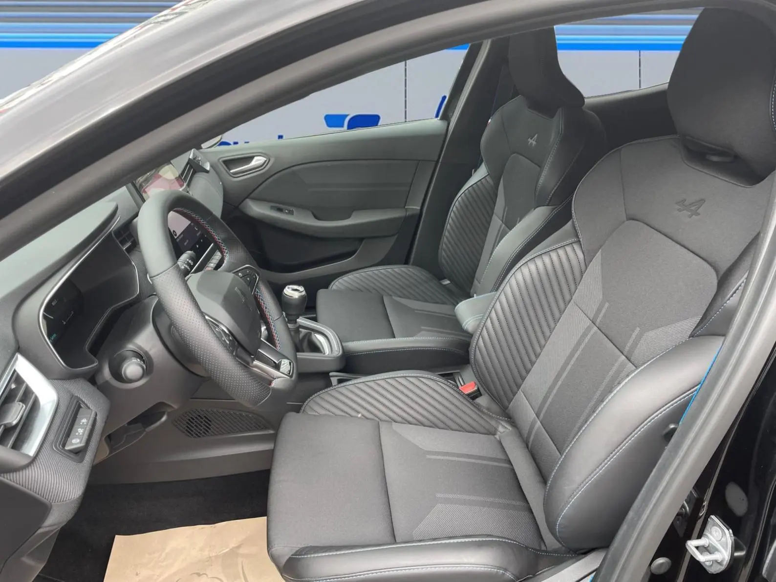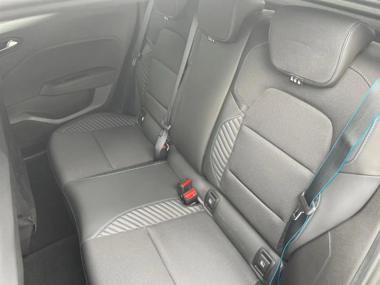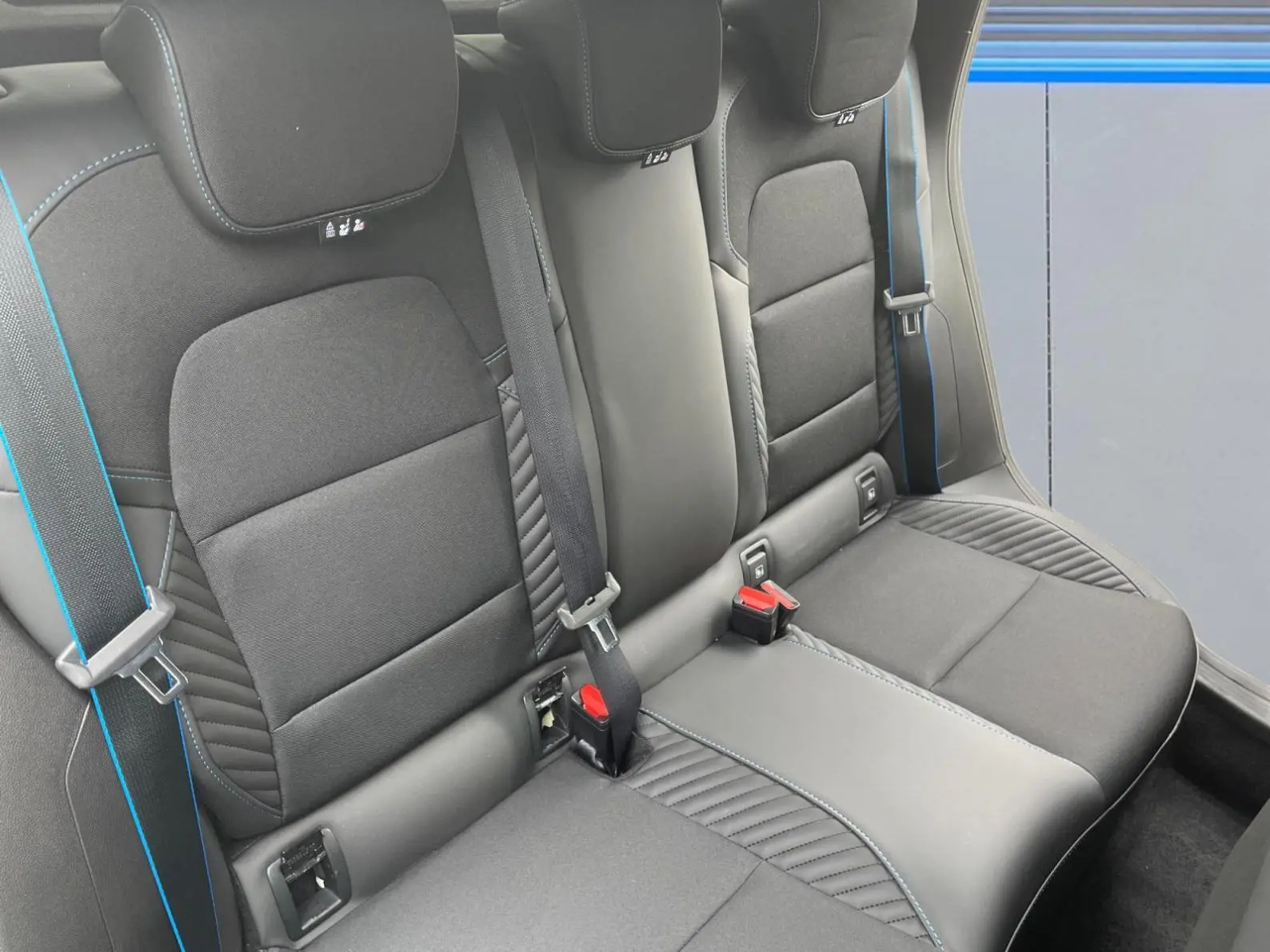 - Sellerie textile gris et textile enduit grainé noir avec surpiqures bleues