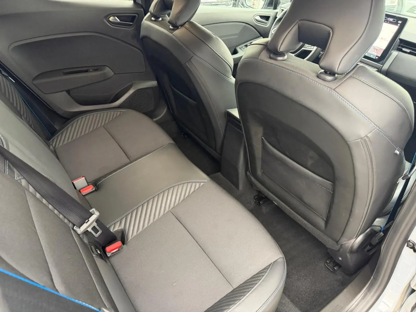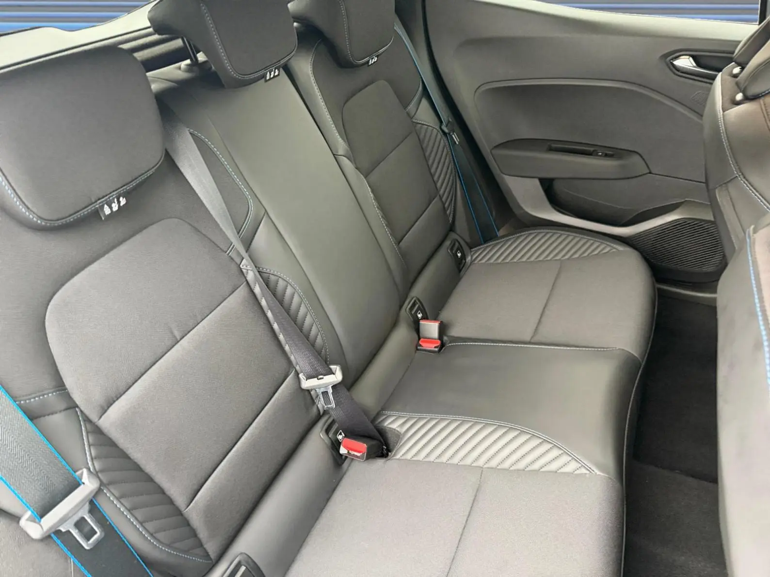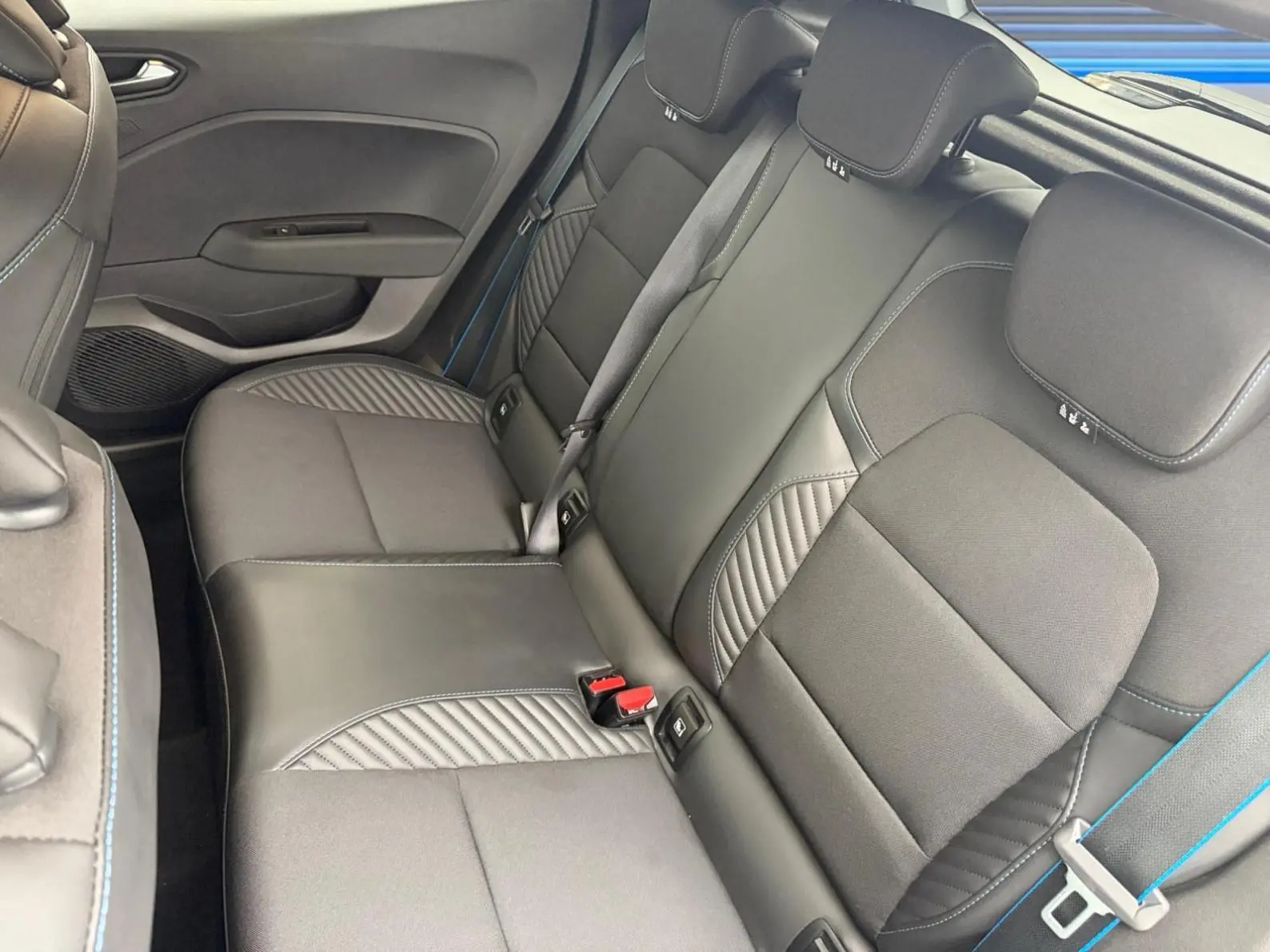 - Sellerie textile gris et textile enduit grainé noir avec surpiqûres bleues