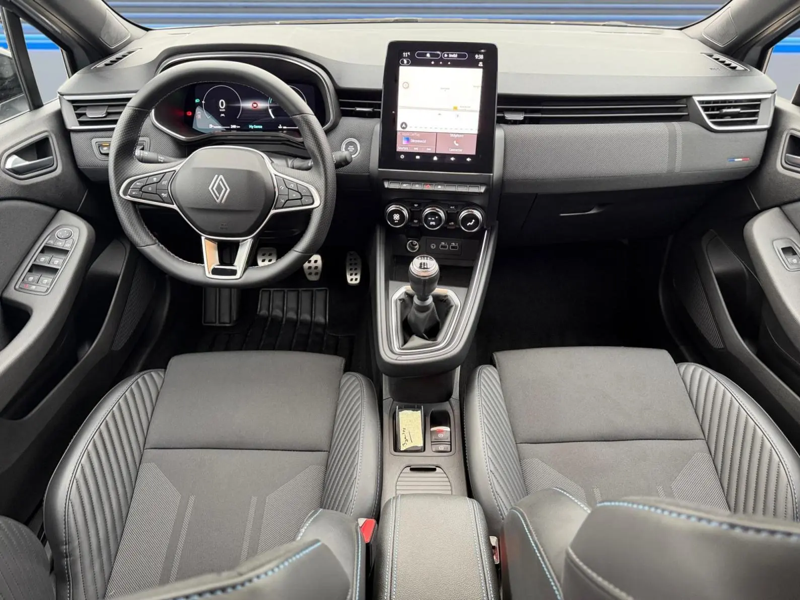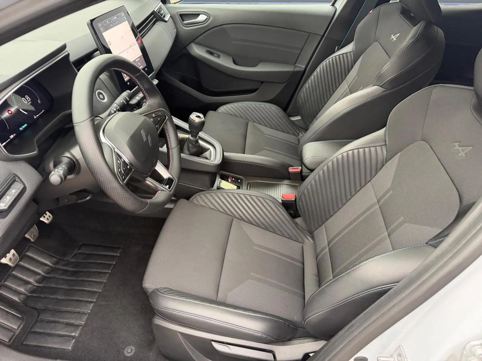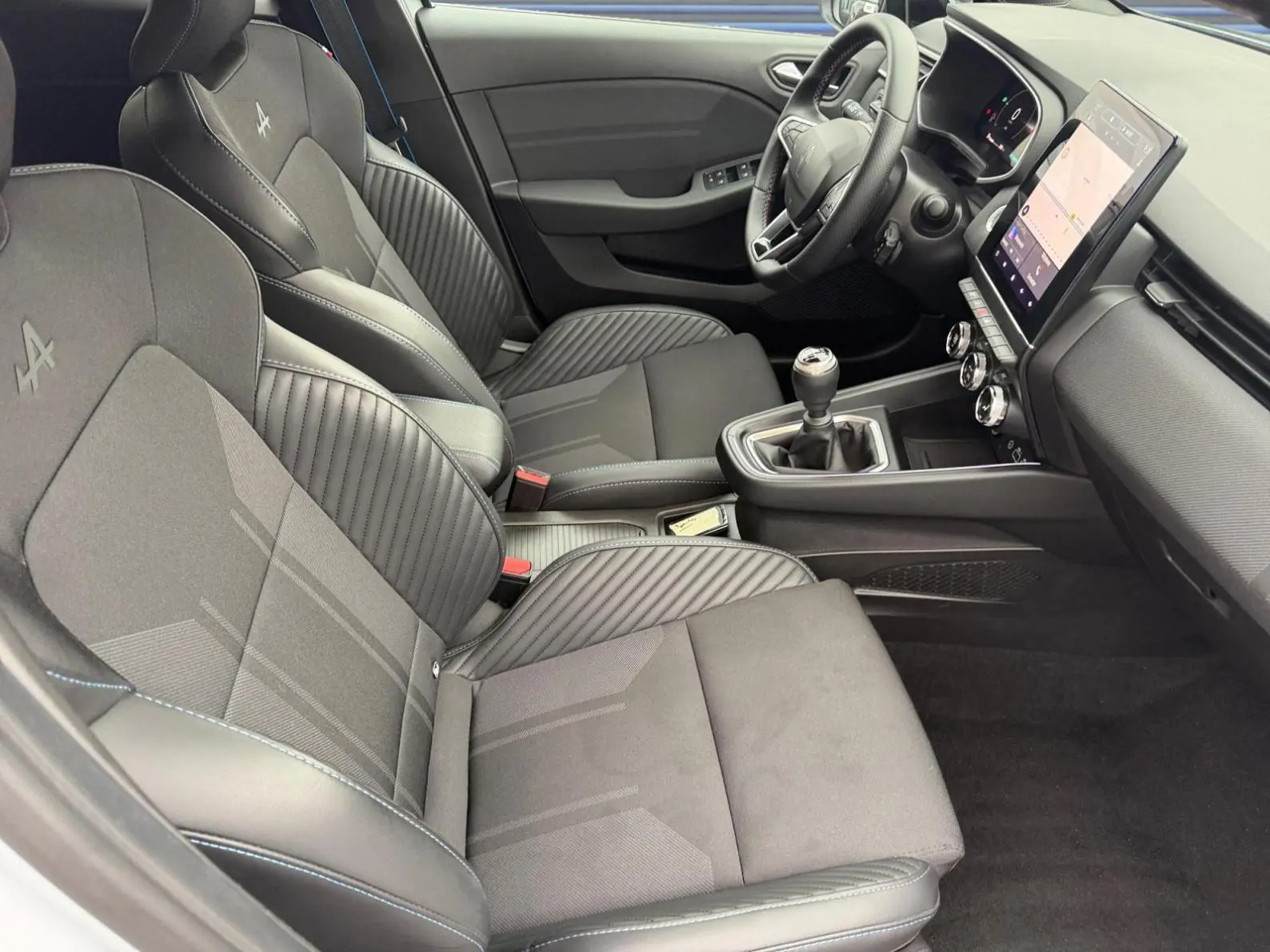 - Sellerie textile gris et textile enduit grainé noir avec surpiqûres bleues