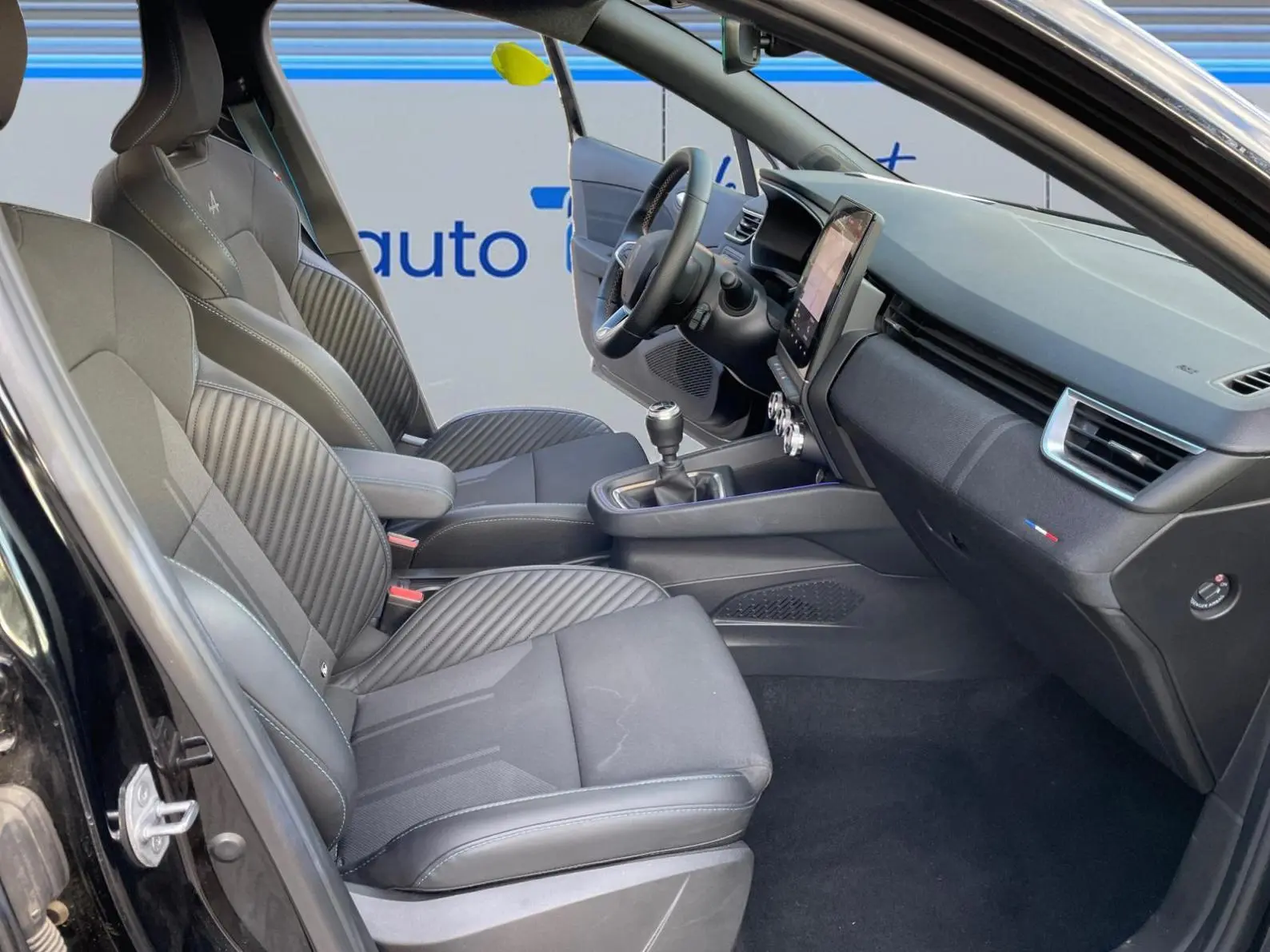 - Sellerie textile gris et textile enduit grainé noir avec surpiqures bleues