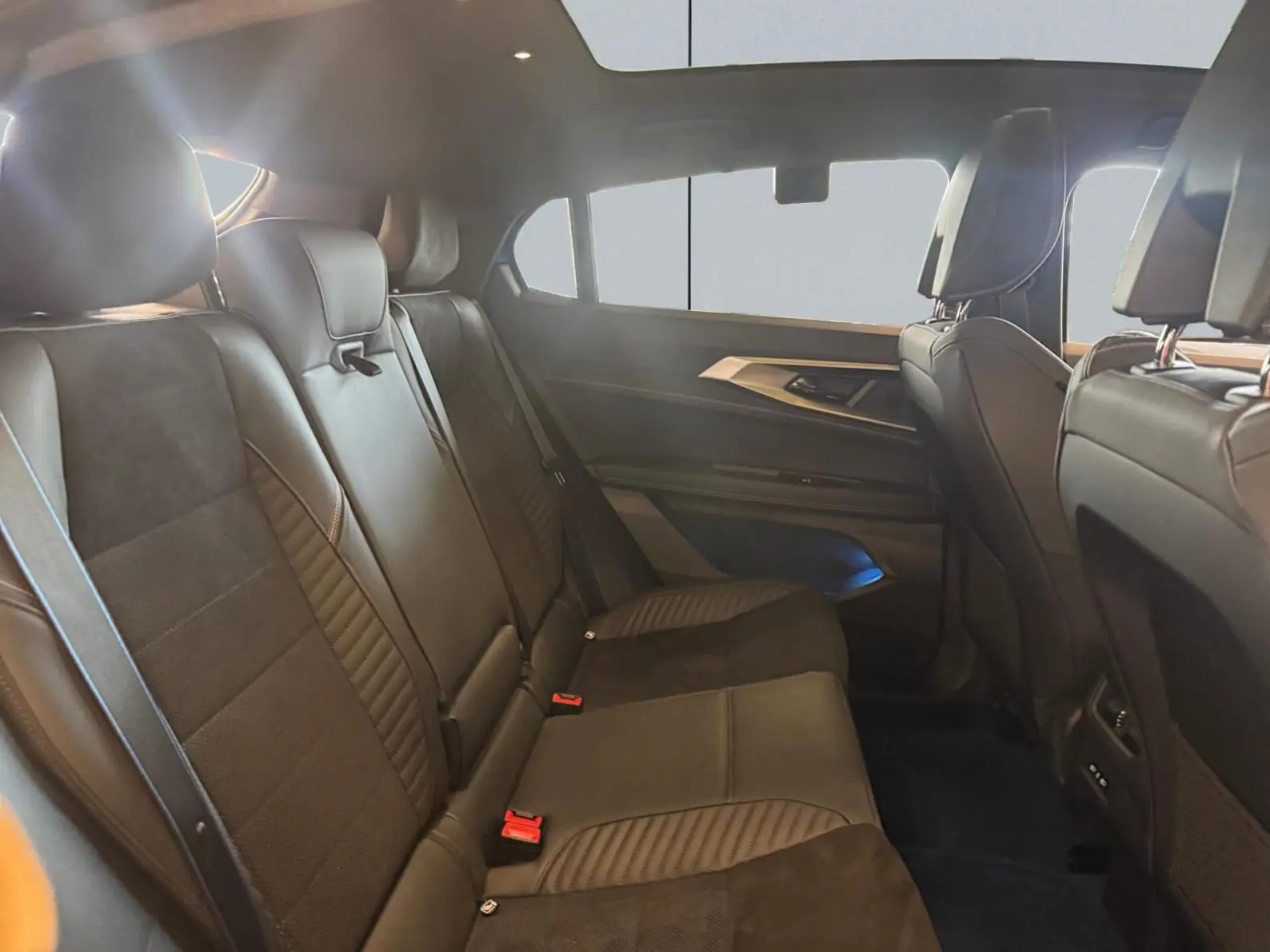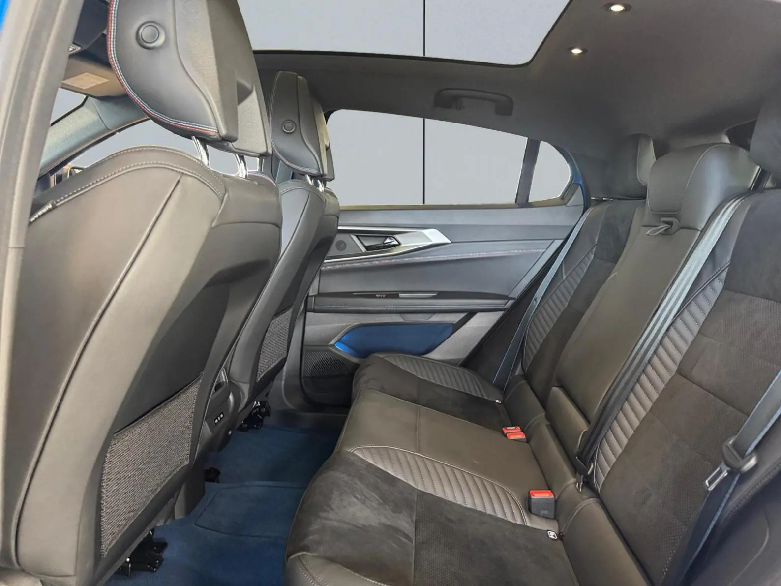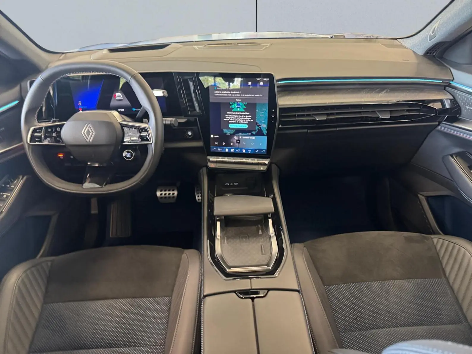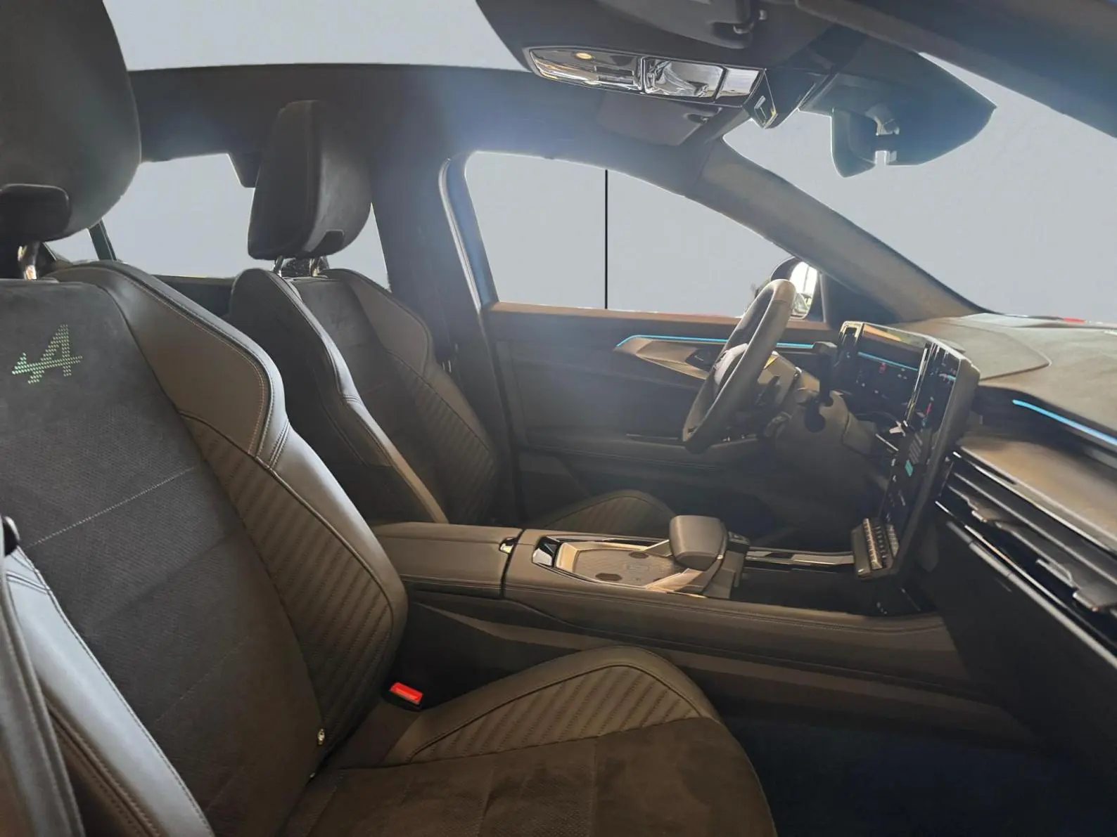 - Sellerie mixte Alcantara avec surpiqûres bleues et logo Alpine lumineux