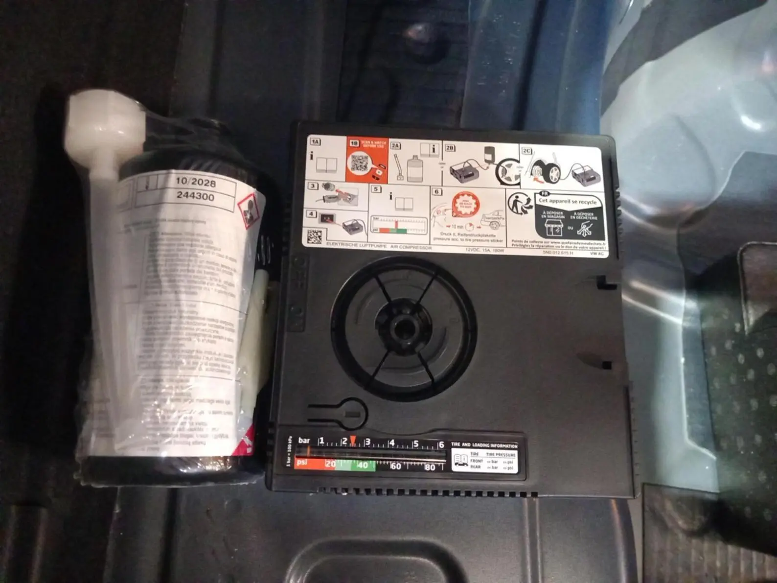 - Kit de dépannage en cas de crevaison incluant compresseur 12 V et produit colmatant